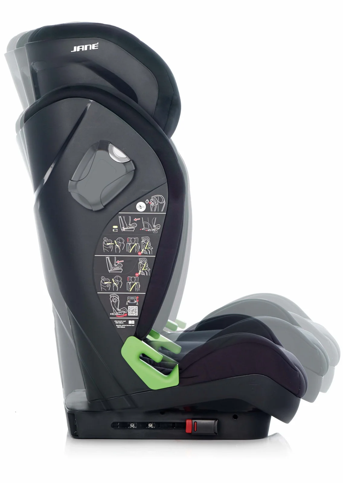 The Jane iRacer i-Size Car Seat is engineered to provide maximum safety and comfort for children between 100 and 150 cm in height, approximately aged 3 to 12 years. This car seat is i-Size approved, complying with the latest European Safety Standard ECE R129, ensuring it is easy to fit, safer, and more secure. It features 4 reclining backrest positions and an 11-position height-adjustable headrest to accommodate your child's growth stages. The seat can be installed using the vehicle’s seat belt and ISOFIX system for enhanced stability and safety, though it can also be installed without ISOFIX anchors. The headrest boasts large wraparound sides for optimal side-impact protection, and the removable upholstery is machine washable for added convenience.